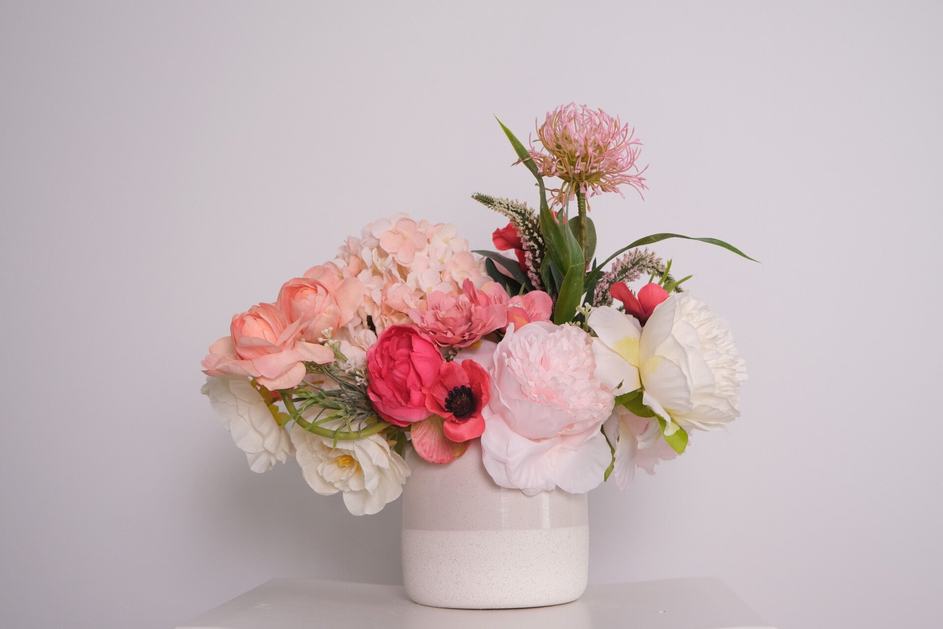 Das Tischarrangement aus der Kollektion "Romantik in Blush" in sanften Rosé- und Lachstönen, die jedem Anlass einen Hauch von Eleganz verleihen. Die Kombination aus leuchtenden roten Tulpen und zarten Lachshortensien sorgt für einen harmonischen Kontrast, während die weißen und zartrosa Pfingstrosen das Gesamtbild mit ihrer Anmut vervollständigen. Abgerundet wird das Arrangement durch die lebhaften roten Mohnblumen, die einen frischen und lässigen Akzent setzen. Lassen Sie sich von der Farbvielfalt und der Schönheit dieser Arrangements inspirieren und verwandeln Sie jeden Tisch in einen Blickfang. Perfekt für alle, die das Besondere suchen!